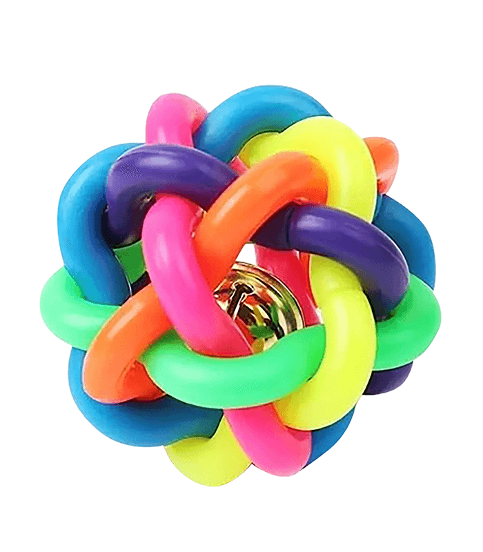 The Rainbow Chew Ball Toy combines chewing fun with sound stimulation thanks to its built-in bell.